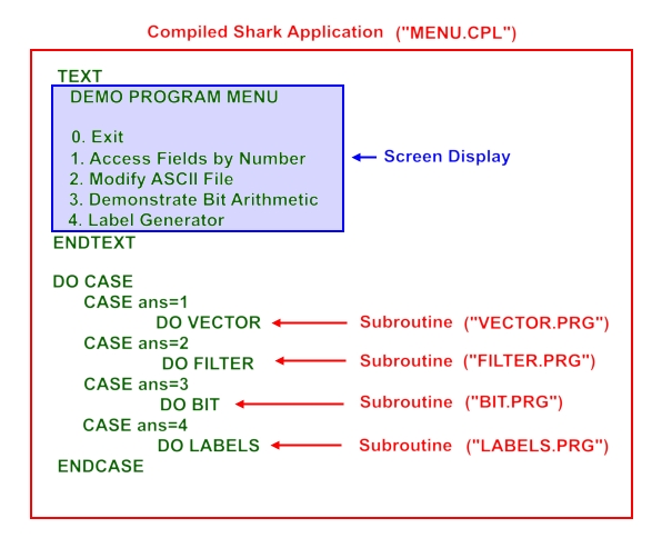 Unlike most database management languages, which execute a program one command at a time, SharkBase compiles its programs - that is, it processes all the commands before it begins to execute them. The Sharkbase "run-time compiler" converts the programmer's text file (the "program") into semi-standalone machine code. The run-time compiled program is more efficient and compact than a stand-alone executable since some of the backend machinery remains in the shark.exe file and doesn't need to be continuously re-loaded as the program runs. Regardless, the result to the user is the same - a much smaller, faster user tool. There is another major bonus in that the compiler functions like a "make" file which verifies the syntax and code of your program before it's handed over to the end user. The advantage to the programmer is that endless numbers of small related programs can be compiled together into one large program in a single step, like this brief (simplified) example from the Demo Programs. To compile four programs (e.g. VECTOR,FILTER,BIT,& LABELS) in one step, the programmer would create the following program 'frame' in SharkBase WRITE (or any other code editor such as NOTEPAD++) and call it, say, MENU.PRG:
